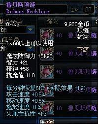 Lv60以上可以使用 魔法防御力+5195 智力+21 精神+58 抗魔值+10 每分钟恢复6HP (实际效果+19) 攻击速度+0.5% 移动速度+0.5% 施放速度+1% 火属性抗性+13 |