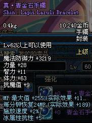 Lv60以上可以使用 魔法防御力+2088 力量+40 智力+40 抗魔值+16 MP最大值+190(实际效果+827) 所有属性抗性+10 |