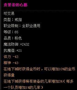 Lv65以上可以使用 魔法防御力+6086 智力+32 精神+74 抗魔值+23 移动速度+3% 地下城内攻击速度+10%